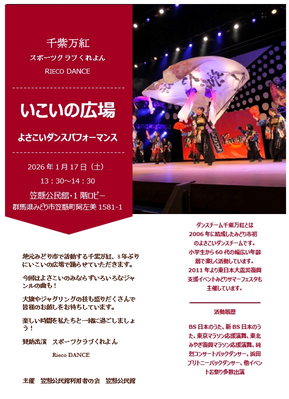 賛助出演してくださるのは桐生市で活動しているスポーツクラブくれよん、ZUMBAのRieco Dance